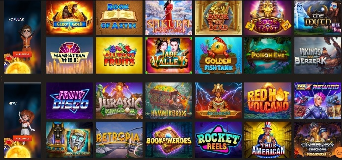 Automaty s ktorými sa tu stretnete sú: Majestátny kráľ, Sakura Fortune, Queen of Fire, Wolf Gold, Poseidon’s Rising, Cleo’s Gold, Eastern Emerald, Book of Aztec, Sticky Bandit, Book of Egypt, Dragon Kingdom, The Dog House, Dragon Shrine, Dwarfs Gone.